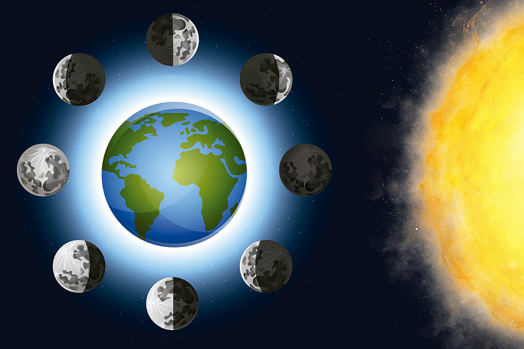 Com la Lluna gira al voltant del sol, té diferents fases, segons el sol: plena, nova, quart.